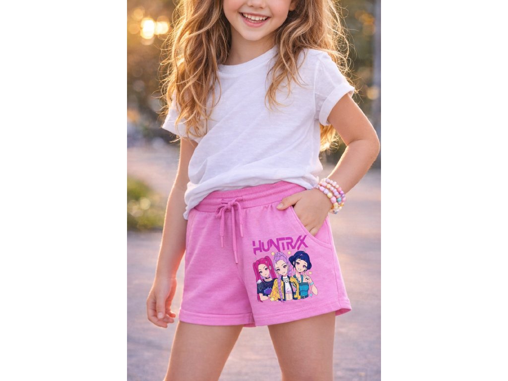 Tyto růžové dívčí kraťasy Huntrix jsou skvělým dárkem pro každou malou fanoušku K-pop stylu a moderního streetwearu. 💕✨