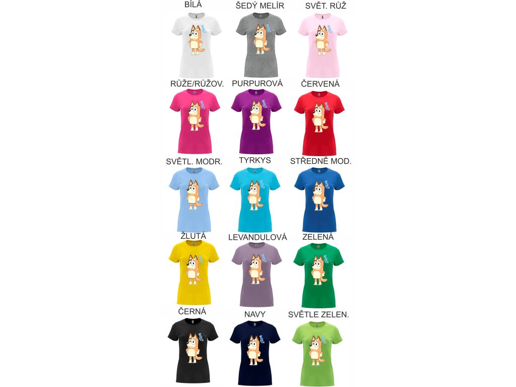 Dámské 100% bavlněné tričko s motivem Chilli Heeler, maminky z oblíbeného seriálu Bluey. Kvalitní DTF potisk, více než 10 barevných variant.