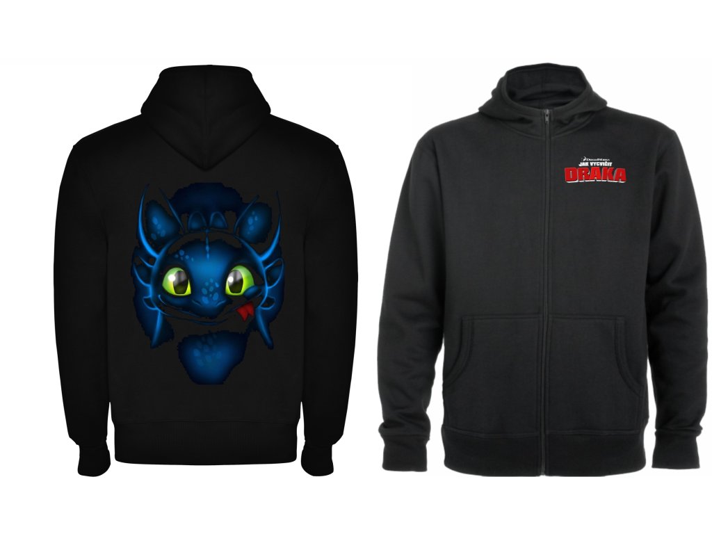 Mikina s potiskem Bezzubky z filmu a seriálů Jak vycvičit draka. Mikina s kapucí a klokaní kapsou s velkým potiskem na zádech s drakem Bezzubky. Mikina Jak vycvičit draka má celopropínací zip