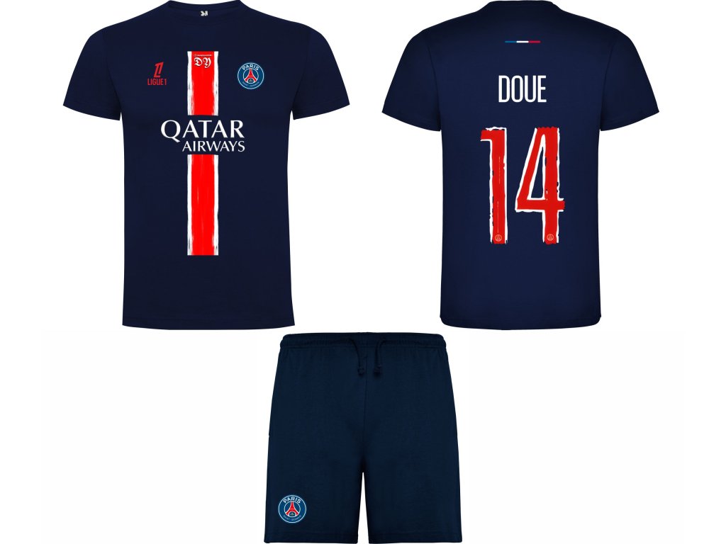 Bavlněný dresový komplet Désiré Doué PSG – pohodlné tričko a šortky inspirované stylem Paris Saint-Germain. Ideální pro fanoušky, kteří chtějí nosit barvy svého klubu i mimo hřiště.