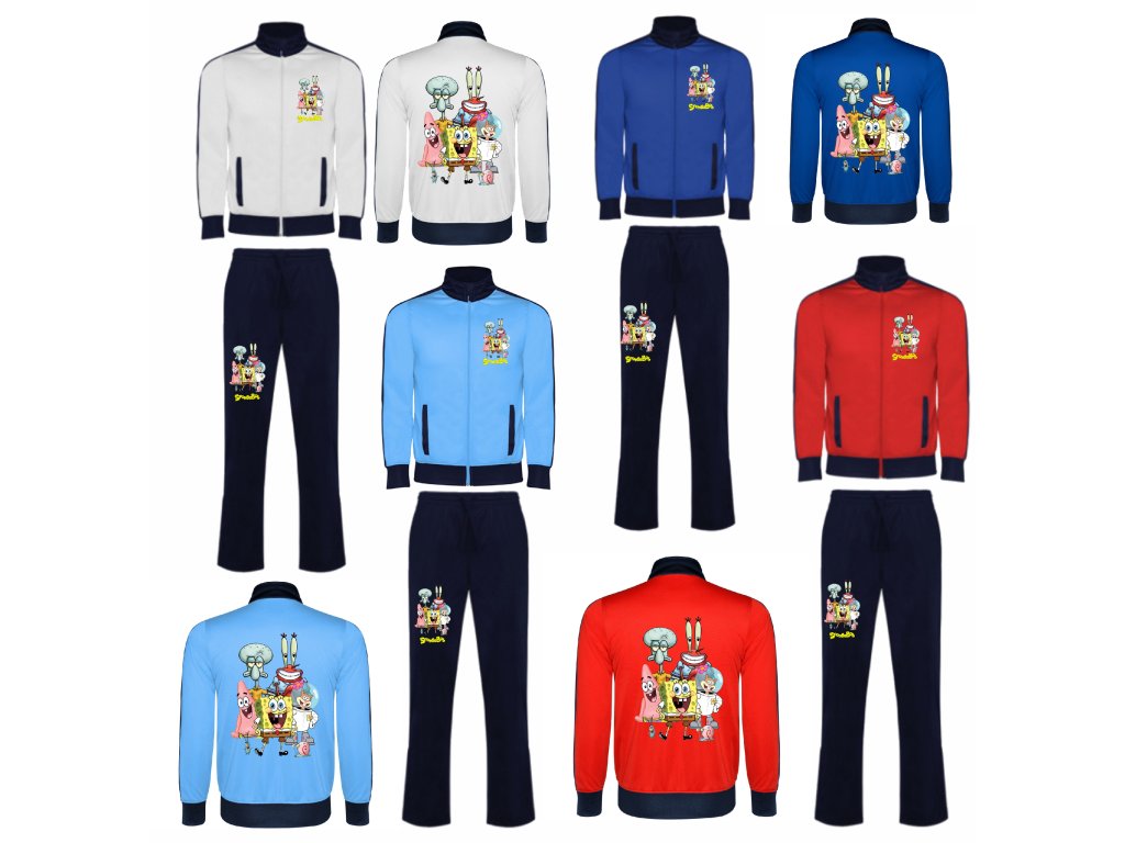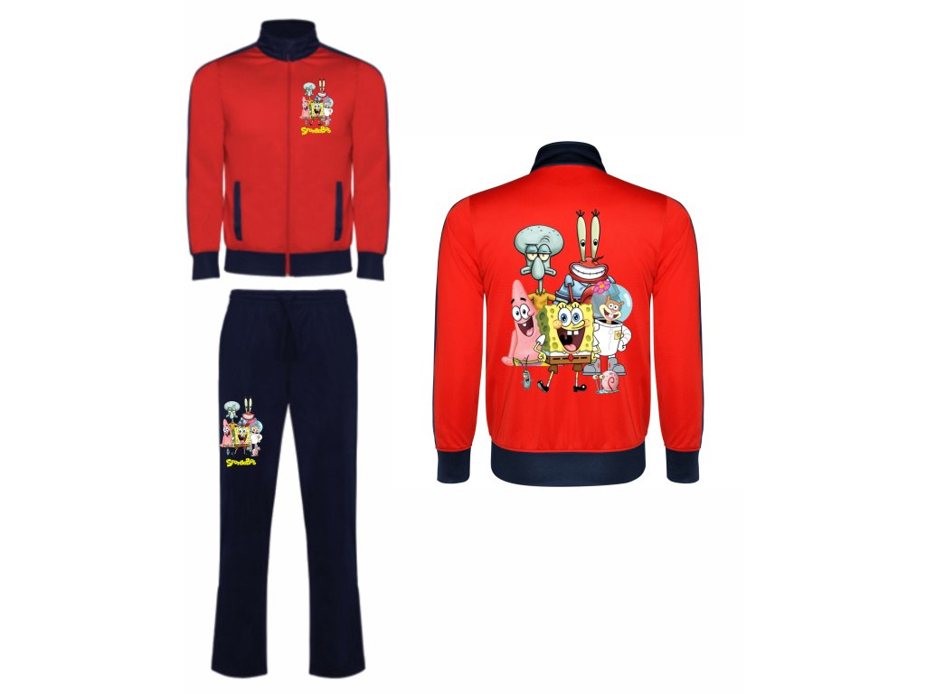 Tepláková souprava SpongeBob Cute. Tepláková souprava se skládá z velmi příjemné bavlny, která na omak působí hedvábně. Na výběr je z několik barev mikin - tepláky jen černé...